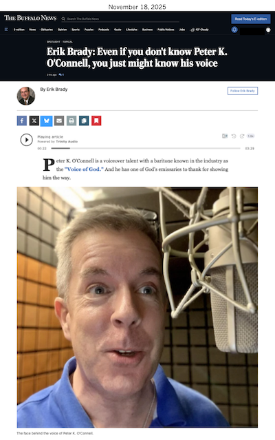 A snippet from buffalonews.com, featuring a profile article on Voiceover Talent Peter K. O’Connell, written by Contributing Columnist Erik Brady – November 18, 2025